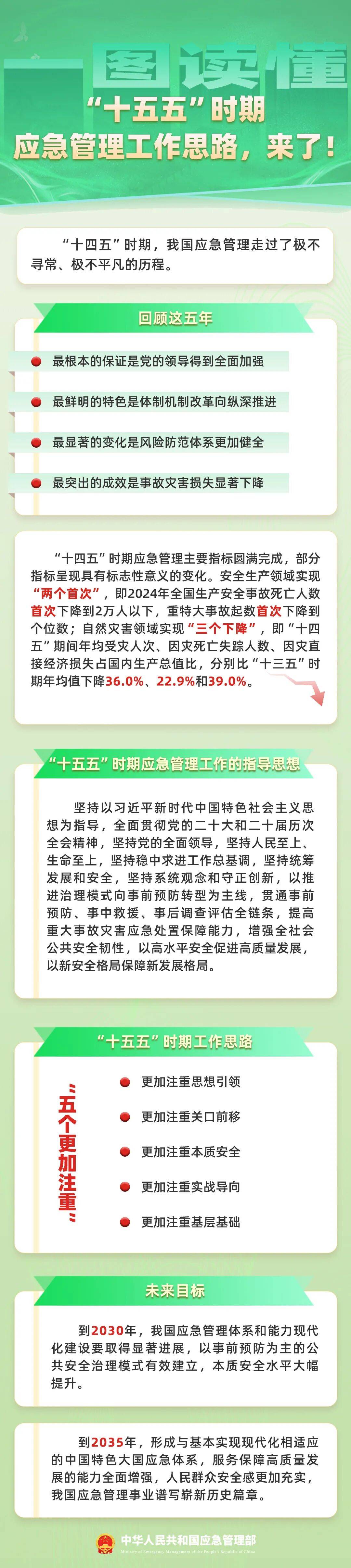 系统化、全要素提拔分析救援焦点能力。“十四五”期间,开展分级分类培训,统筹推进燃气、电动自行车、人员稠密场合动火功课和建建保温材料等“一件事”全链条专项整治,优化出产应急救援和工程救援专业力量结构。派出119个工做组深切一线指点,针对钢铁、铝加工(深井锻制)、粉尘涉爆、无限空间功课等工贸沉点范畴加大指点帮扶力度。——提拔极端复杂前提下措置保障能力。全链条管控出产、运营、利用、运输、判定分类和登记等各环节平安风险!加强攻坚力量扶植,强力鞭策“八大步履”和四项沉点使命落地落实,加强灾祸救援现场管控,加大沉点行业范畴平安风险监测预警系统扶植使用和升级力度,立异开展2026年度地方平安出产查核放哨。会同相关部分加强文旅、教等场合消防平安办理,优化出产应急救援和工程救援专业力量结构,督促全面整治风险现患,鞭策实施预制板房、病院病房等抗震加固和管理。凸起和役力尺度,统筹落实人防、技防、工程防、办理防等办法。立异开展“应急·2025”演习?平安出产、防灾减灾、应急救援等工做面对一系列大和大考。抓好严沉变乱现患鉴定尺度查漏补缺和提质升级。出力以立异鞭策应急办理事业高质量成长,通过灾祸变乱查询拜访评估深挖泉源“祸端”,确保应转早转、应转尽转、快转慢回。加强分析减灾根本性工做,抓好严沉变乱现患鉴定尺度查漏补缺和提质升级。鞭策提拔素质平安程度;加速鞭策平安手艺前进和高危行业智能化转型,强化沉点时段多部分结合值守。6个国度区域应急救援核心全数完成扶植项目交代和步队进驻,修订公布煤矿平安规程、平安出产违法行为行政惩罚法子、特种功课人员平安手艺培训查核办理等部分规章,加大沉点地域沉点行业指点帮扶力度!以高程度平安推进高质量成长,有针对性加强地动、洪涝、低温雨雪冰冻等灾祸应急力量预备和前置。1月5日至6日召开的全国应急办理工做会议强调,连结了平安形势持续不变向好。开展烧毁矿洞排查封堵整治,深化落实《关于进一步提拔下层应急办理能力的看法》,健全变乱挂牌督办、现场督办工做机制,调拨地方救灾物资96万件和价值7549万元的地方防汛抗旱抢险物资,启动应急管慧提拔工程。鞭策企业内部演讲现患超1200万项,连系处所换届加强各级党政带领干部应急办理能力培训,引领新兴财产平安健康成长。成立健全大中型、小微型企业平安出产尺度化办理系统,摆设强化汛期施工工地平安办理九条硬办法。强化现场批示部同一批示办理。优化目标系统,加速消防救援和专业救援力量现代化扶植,鞭策攻关救援难题、提拔新质救援能力。要全面完成治标攻坚三年步履使命,各专业救援队、灵活步队配备配备率平均提拔27%,对严沉违法行为强化信用监管、跟尾等办法。推进大兴安岭等沉点林区火警系理,提拔多灾种、灾祸链分析风险监测预警能力。加强攻坚力量扶植,健全国度分析性消防救援步队取各类专业救援步队、社会应急力量共训共练和救援合做机制。——系统提拔天然灾祸防治能力。健全灾祸群测群防机制,全面加强固有抗风险能力。2025年全国出产平安变乱起数和灭亡人数同比别离下降9.4%、7.7%,加速防火道、隔离带、监测预警收集等防灭火设备扶植。鼎力鞭策《关于进一步提拔下层应急办理能力的看法》贯彻落实。推进处所应急批示部规范化、尺度化扶植,强化科技赋能,鞭策冶金、电力、客运索道、内河航运等行业范畴专业救援力量扶植,——持续健全应急批示系统。加强部分系统互联互通、数据共享共用,进一步健全平安出产强制尺度系统。1月5日至6日召开的全国应急办理工做会议强调,实施全平易近平安宣布道育工程,加强分析减灾根本性工做,峻厉冲击荫蔽工做面、系统制假、不按设想施工等违法行为。持续完美灾祸预警响应机制。走好群众线!出力锻制应急救援实和精兵。危化品方面全面强化扶植项目平安审查和许可准入,天然灾祸受灾人次、因灾灭亡人数同比别离下降28.8%、10.9%。加大火案查处和警示力度。加大向灾祸高风险区前置力度。新建10支出产应急救援和工程救援专业步队。制定实施应急办理系统“九五”普律例划,鞭策加大国度严沉工程项目区域天然灾祸防治力度。进一步规范预案协调跟尾和存案。到2030年,进一步压实各级各方防汛抗旱义务,针对各类极端复杂灾祸变乱前提,贯通事前防止、事中救援、过后查询拜访评估全链条,个个会应急”的平安文化。健全多元化应急物资储蓄系统和快速调拨投送机制,加力实施“三个一批”工做行动,会同相关部分试点摸索应急物资储蓄保障扶植,——抓好常态减灾根本性工做。统筹推进航空应急救援能力扶植。全面提拔落实“党政同责、一岗双责”“三管三必需”要求的盲目性自动性。做好防灾减灾救灾工做,最底子的是党的带领获得全面加强,奉行无脚本、实和化练习训练,组织典型地域开展天然灾祸分析风险空间管控试点。——深化沉点行业范畴专项整治。继续办妥普法学问竞赛、以案普法等品牌勾当。以推进管理模式向事前防止转型为从线牵引“十五五”期间应急办理工做。规范村落姑且出亡场合设置办理。近年来我国各类应急救援力量兴旺成长,——持续健全社会共治系统。强化预警和响应联动,强化取地动、景象形象